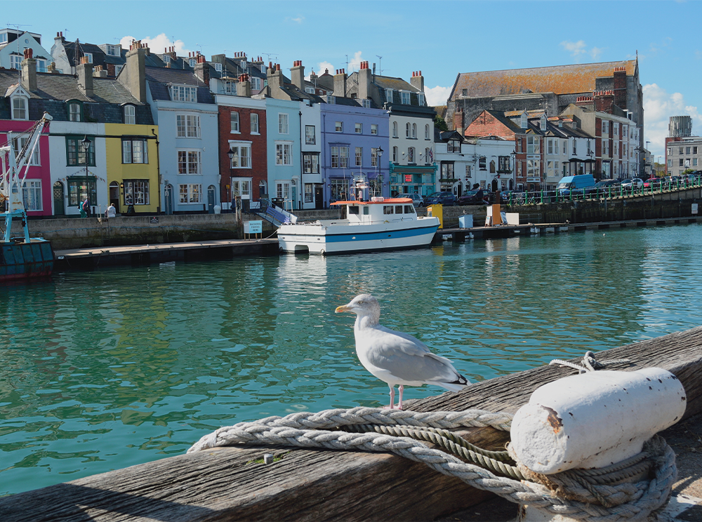 The sweeping curve of Weymouth’s Georgian and Victorian seafront is one of Dorset’s most famous coastal views. It became nationally known when King George III visited the town and helped establish Weymouth as one of Britain’s earliest seaside resorts.